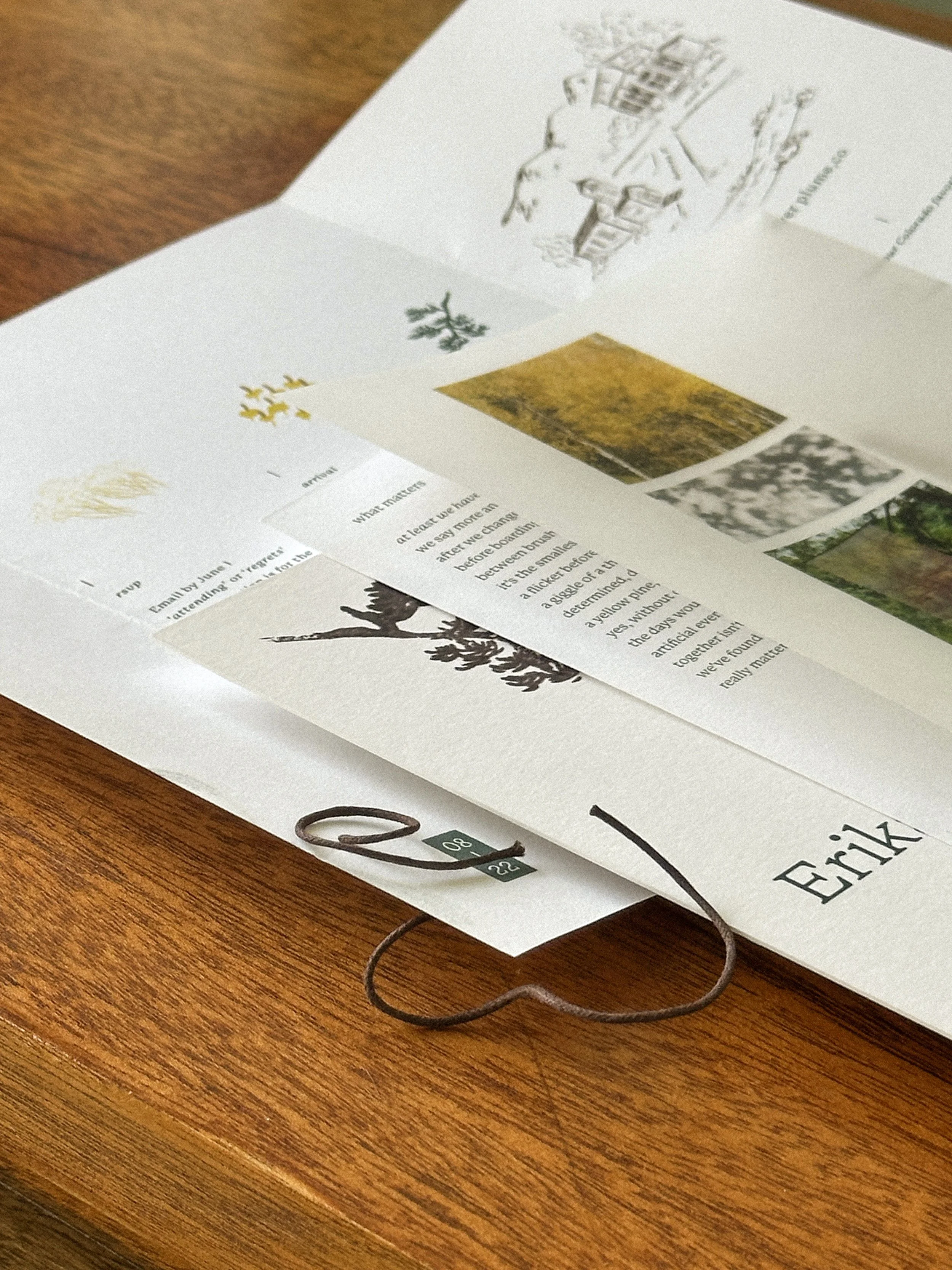 Creatively directed and designed a natural, alpine wedding. Inspired by Japanese minimalism and the Colorado landscape. The couple, both artists, wanted a tangible invitation suite that showcase his photography and her poetry. For the day of the event, I designed the florals and directed the set up of the reception. We created a “backyard garden” out of a gravel parking lot outside of a small, mountain town bar.
